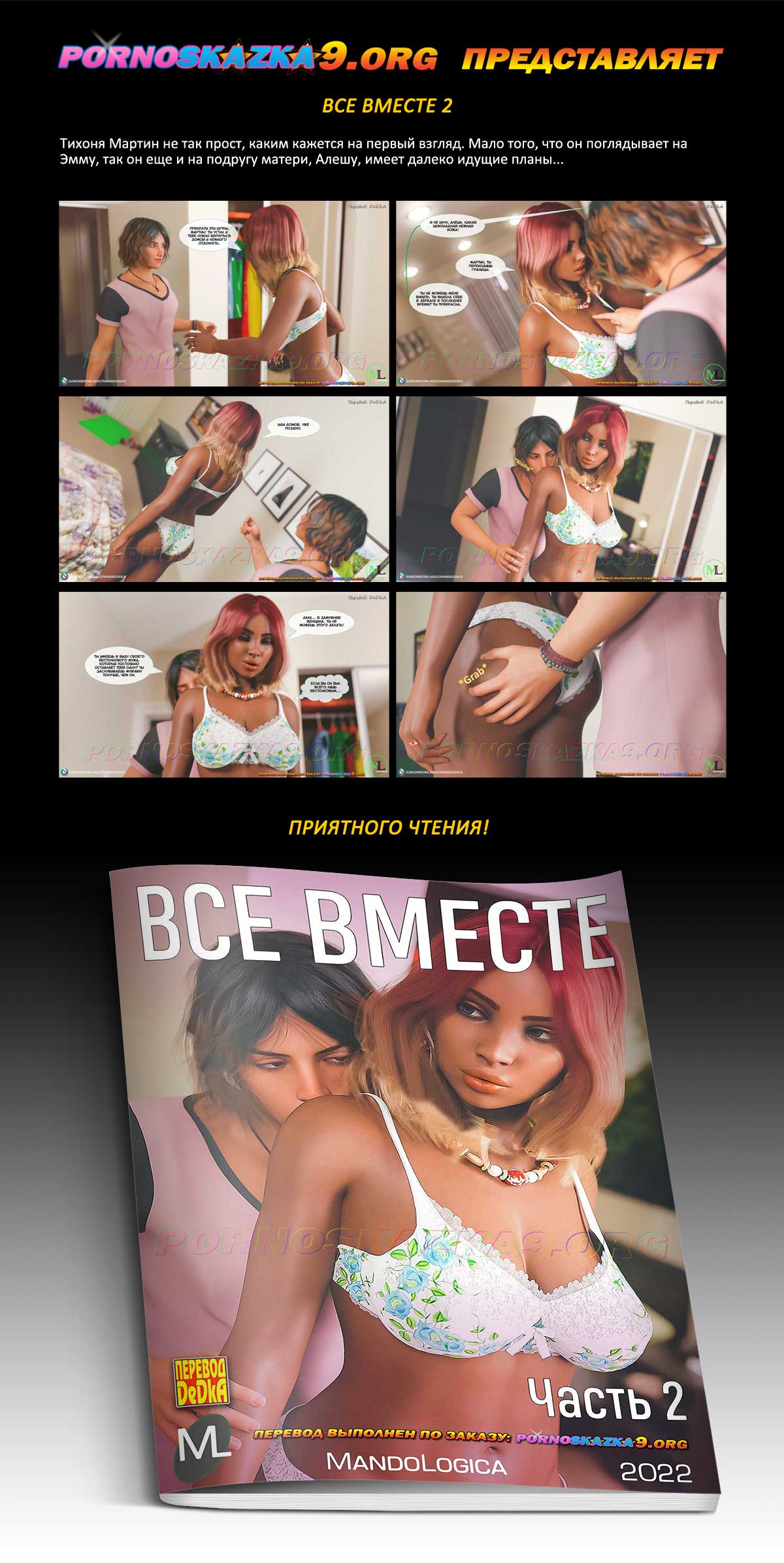 Порно комикс «Все вместе. Часть 2.» Тихоня Мартин не так прост, каким кажется на первый взгляд. Мало того, что он поглядывает на Эмму, так он еще и на подругу матери, Алешу, имеет далеко идущие планы…